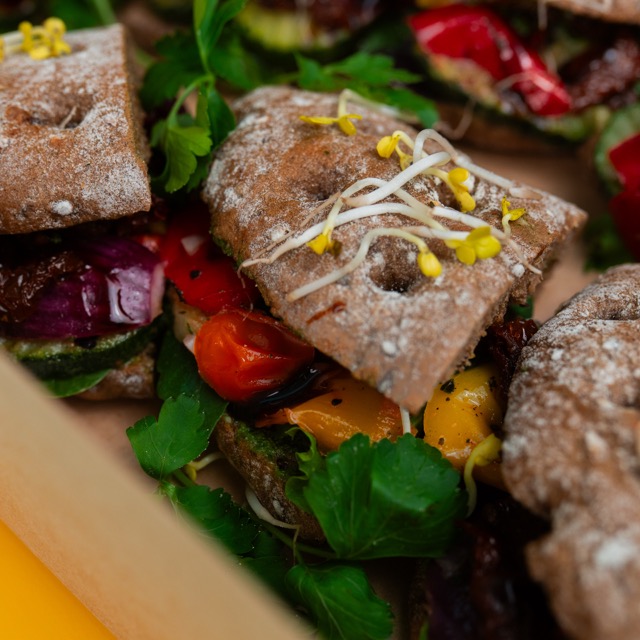 8x halbes Flaguette Veggiterrano mit Grillgemüse, getrockneter Tomate, gemischtem Blattsalat, Balsamico Glace & Basilikumpesto (vegan)